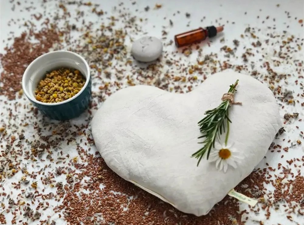 Polnjen je z naravno mešanico riža, lanenega semena in suhih cvetov kraške sivke, ki po segrevanju oddaja prijetno toploto in nežno diši po domačnosti.